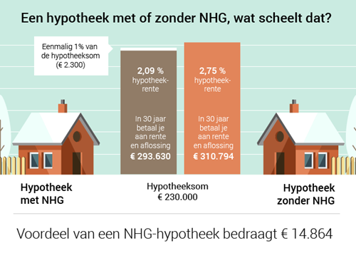 Voor een annuïteitenhypotheek mét NHG van € 230.000 betaal je verspreid over dertig jaar € 295.930 aan aflossing en rente. Zonder NHG kom je bijna € 15.000 hoger uit, op € 310.794.