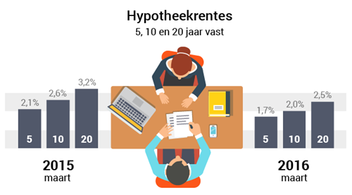 Dan de kosten. Het verschil tussen een 5 jaar vaste hypotheekrente en een 10 jaar vaste hypotheekrente is 0,3%. Het verschil tussen 10 en 20 jaar is 0,5%. Kies je voor een hypotheek van € 200.000 waarbij de rente 10 jaar vast staat, dan betaal je in vergelijking tot een hypotheek met een rente die 5 jaar vast staat maandelijks € 35 netto extra. En € 90 voor 20 jaar zekerheid over je hypotheeklasten.