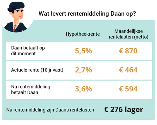 • Daan betaalt op dit moment 5,5% hypotheekrente. Zijn rentevaste periode loopt nog drie jaar