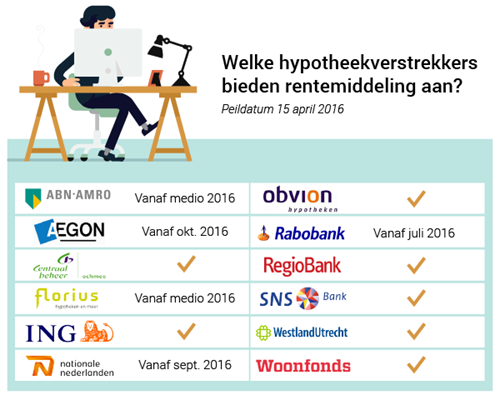 Lang niet alle hypotheekverstrekkers bieden rentemiddeling aan. Ook de kosten blijken per bank nogal te verschillen. Zo betaal je bij Centraal Beheer Achmea en Woonfonds geen advies- en administratiekosten, terwijl die bij ING oplopen tot € 900. En dat heeft behoorlijk invloed op of rentemiddeling voor jou interessant is.