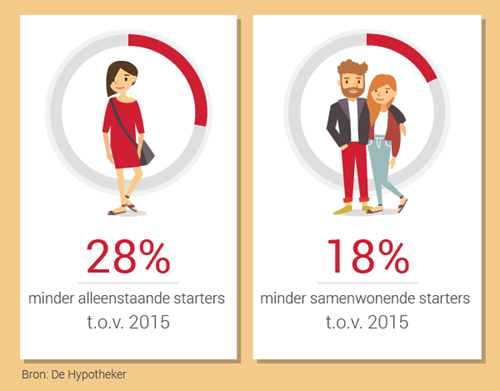 Alle starters, singles en samenwonenden, ondervinden sowieso veel last van de huidige leenregels. Dit jaar kun je maximaal 102 procent van de koopsom lenen. Dat loopt verder af tot maximaal 100 procent in 2018. Voor een doorstromer met wat overwaarde op zijn vorige huis is dat meestal geen probleem. Een starter daarentegen heeft in 2018 al gauw 20.000 euro eigen geld nodig om een huis te kopen.