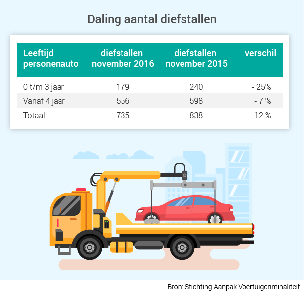 De AVc publiceert elke maand cijfers over de diefstal van voertuigen. In november was een duidelijke afname hiervan te zien, vooral van nieuwere auto’s. Me details kun je vinden op de website van de AVc. Bijvoorbeeld welke merken veel gestolen worden en de verschillen per regio.