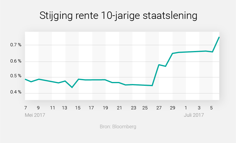 De Nederlandse overheid betaalde eind juni nog een jaarlijkse rente van 0,45 procent bij een tienjarige lening. Bij de laatste meting is dit 0,75. Een stijging van ruim 65 procent. Historisch gezien nog steeds een laag tarief, in 2015 betaalde de staat met 2,3 procent fors meer. Ook elders in Europa zien we in de laatste weken de rente op overheidsleningen stijgen.