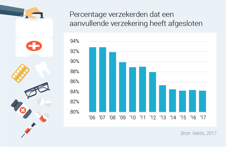 De kosten voor de aanvullende zorgverzekering kunnen afhangen van je leeftijd. Jonge mensen hebben over het algemeen minder zorg nodig, een verzekeraar kan daarom lagere premies rekenen. De afgelopen jaren is te zien dat vooral jonge gezinnen de aanvullende zorgverzekering links te laten liggen. Het percentage Nederlanders dat wel een aanvullende polis afsloot daalde van 94 procent in 2007 tot 84 procent bij de laatste meting in 2015.