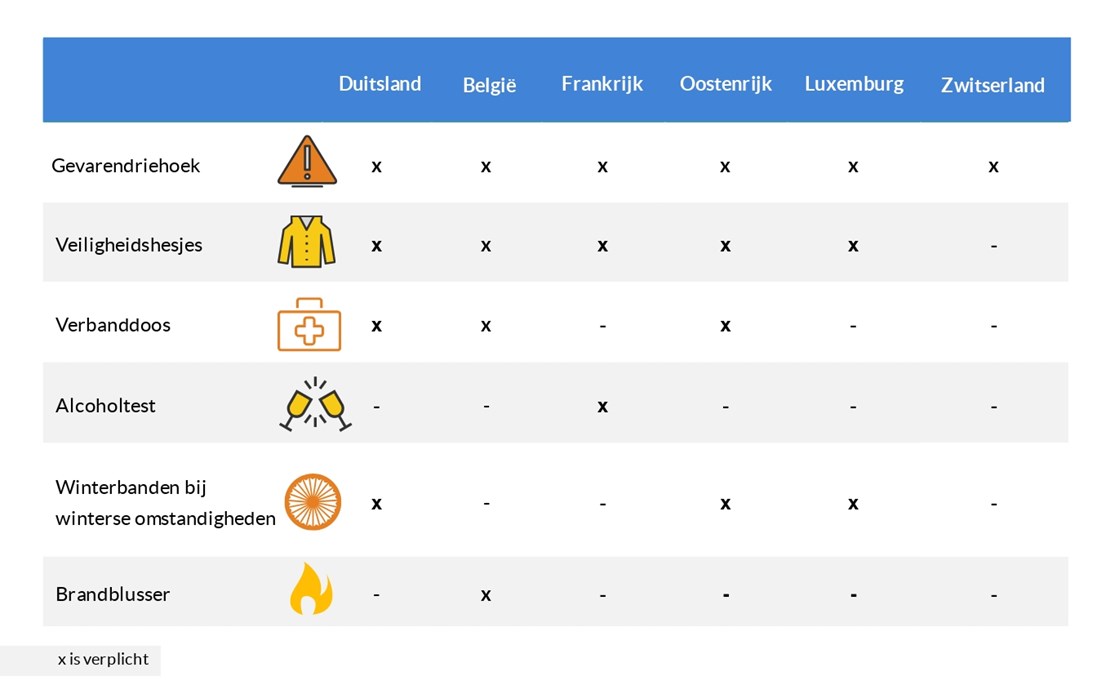 Verplichtingen zijn in het buitenland soms anders dan in Nederland. Kijk voor vertrek welke landen je doorkruist en welke regels daar gelden. Wij zetten per land de verplichte veiligheidsattributen voor in de auto op een rij: