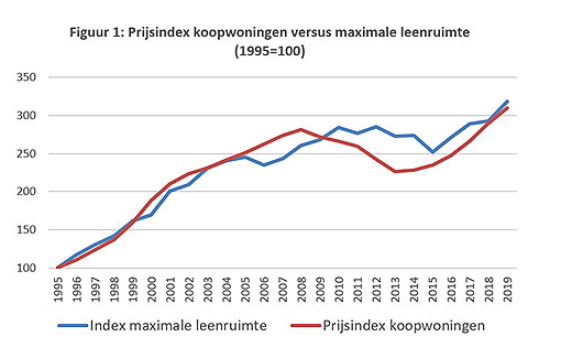 In de onderstaande tabel zie je de leenruimte in relatie tot de gemiddelde prijs van woningen. Hiervoor heeft DNB gekeken naar de gemiddelde maximale hypotheek op basis van de Nibud normen en het gemiddelde inkomen van huishoudens in het betreffende jaar. De lijnen lopen aardig gelijk op. Reden hiervoor is dat relatief veel Nederlanders relatief een koopwoning hebben, met een hypotheek die tegen de maximale leenmogelijkheden aanligt.
