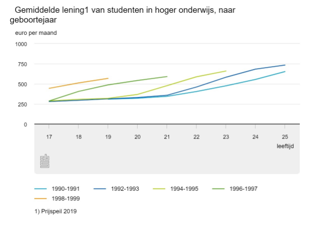 Uit de analyse blijkt dan jongere generaties studenten vaker en meer lenen. Van de studenten die in 1992-1993 geboren zijn, had twintig procent een lening. Bij de studenten die geboren zijn in 1998-1999 is dit zestig procent. Deze lening ligt gemiddeld ook nog eens €210 hoger.