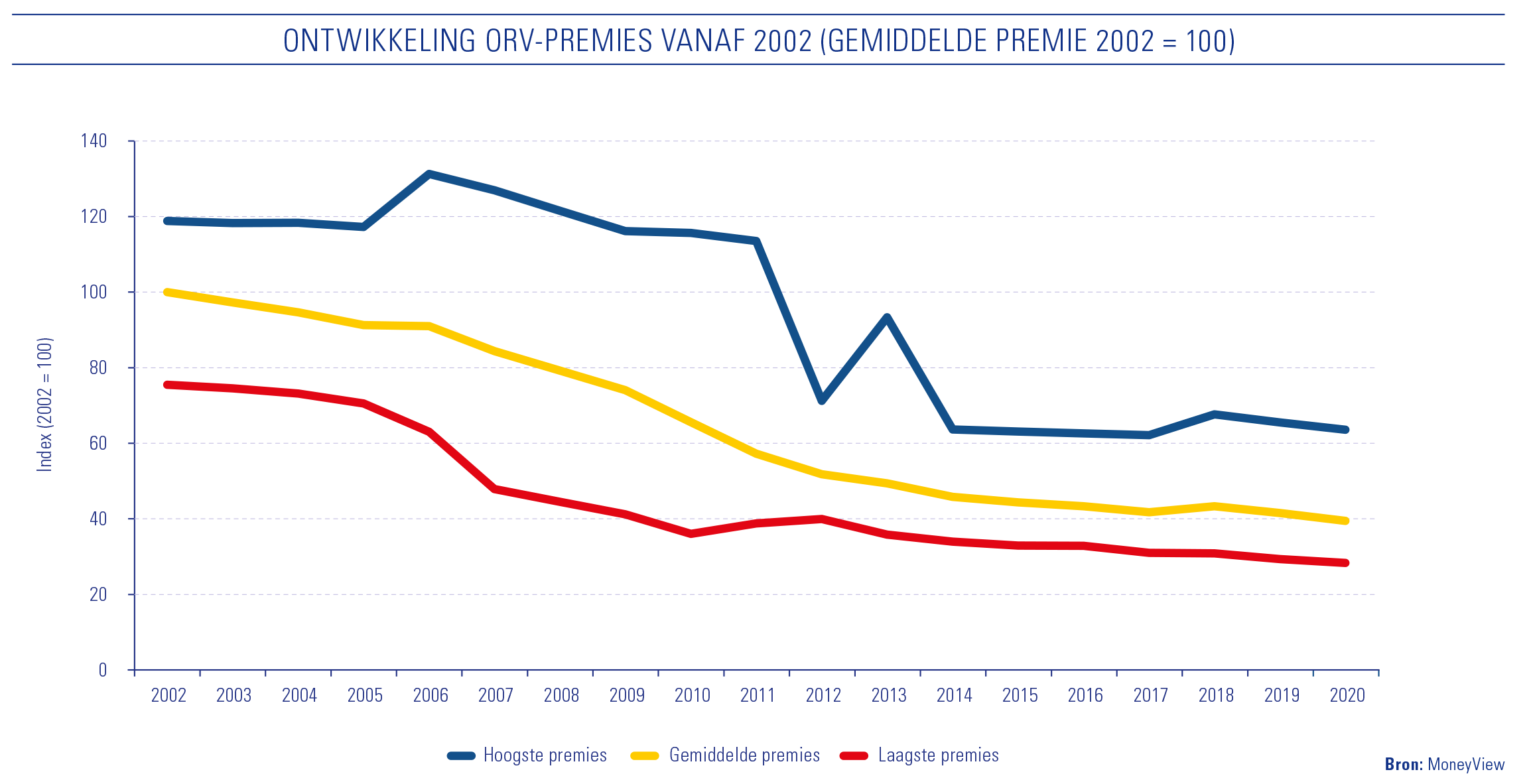 De laatste prijsanalyse van MoneyView over de ORV stamt uit 2017. Sinds begin 2018 is de verzekering niet verplicht meer bij het afsluiten van een hypotheek met Nationale Hypotheek Garantie. Hoogste tijd voor een nieuwe analyse. In 2020 is de gemiddelde ORV-premie 5% gedaald ten opzichte van 2019. Kijken we verder terug, dan loopt het verschil hard op. 20 jaar geleden lag de premie namelijk maar liefst 61% hoger. Dit is het verloop over de laatste 19 jaar: