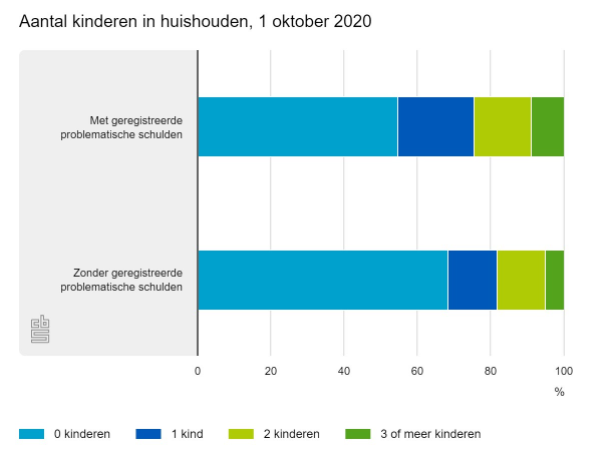Huishoudens met problematische schulden tellen vaker één of meer thuiswonende kinderen. Op 1 oktober 2020 had 45,3% van de huishoudens met problematische schulden één of meer kinderen, tegenover 31,4% van de huishoudens die geen problematische schulden hadden.