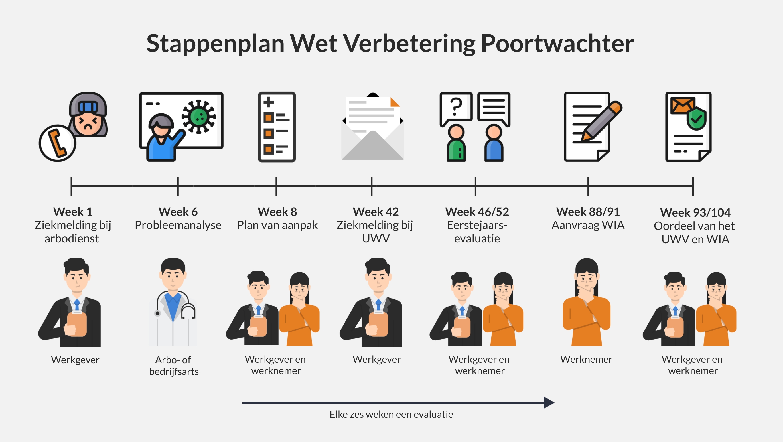 Je verplichtingen voor de Wet Verbeter Poortwachter beginnen al in de eerste ziekteweek van een medewerker. In onderstaand overzicht geven we schematisch weer welke stappen je verder moet doorlopen. Wanneer de ziekte langer dan zes weken duurt, is het bijhouden van een re-integratiedossier verplicht. Hierin staan afspraken over de re-integratie en het plan van aanpak (stap 3). Daarnaast wordt in het dossier het verloop van de ziekte en de re-integratie bijgehouden. Houd een vinger aan de pols en evalueer elke zes weken met de werknemer hoe de re-integratie verloopt.