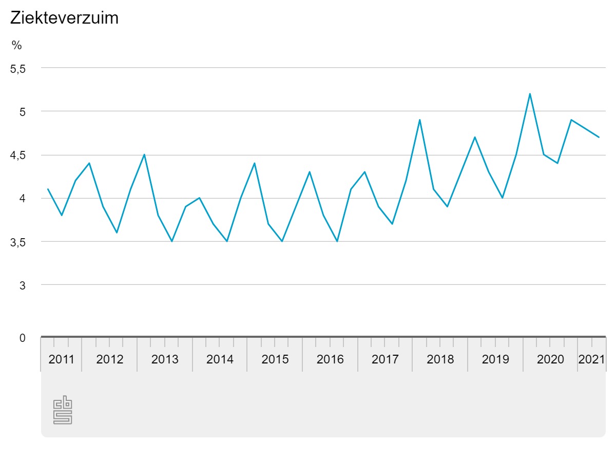 Het gemiddelde ziekteverzuim ligt rond de 4,5 procent, zo blijkt uit cijfers van van het Centraal Bureau voor de Statistiek (CBS). Per 100 werkdagen meldt een werknemer zich 4,5 dag ziek. Over het algemeen is het ziekteverzuim het hoogst in het eerste kwartaal van het jaar en ligt in kwartaal drie het dieptepunt. Over de hele linie is er een stijgende lijn in het ziekteverzuim zichtbaar.
