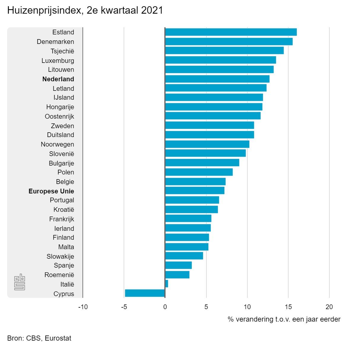 De huizenprijzen zijn in Nederland sterk gestegen, ook in vergelijking met andere landen uit de Europese Unie. Er zijn maar vijf landen die we voor ons moeten dulden, zo blijkt uit cijfers van het CBS. Alleen in Cyprus nam de gemiddelde prijs van een woning af in het tweede kwartaal. De gemiddelde daling bedroeg daar vijf procent.