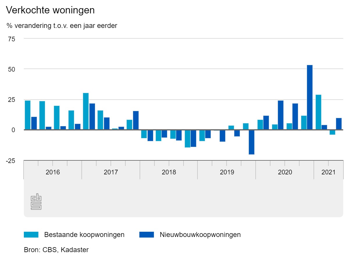 De prijsstijging van bestaande koopwoningen was de hoogste jaar-op-jaar-stijging in 20 jaar. Meer recente cijfers van makelaarsvereniging NVM laten zien dat deze trend in het derde kwartaal verder heeft doorgezet. Woningen werden gemiddeld voor €419.000 verkocht, 19 procent meer dan in dezelfde periode vorig jaar.