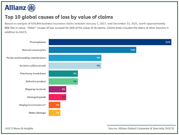 Allianz Global Corporate & Specialty (AGCS) is tussen 2017 en 2022 betrokken geweest bij 530.000 schadeclaims in meer dan 200 landen en gebieden. De claims hebben in totaal een geschatte waarde van 88,7 miljard euro. De belangrijkste oorzaken van schade zijn: