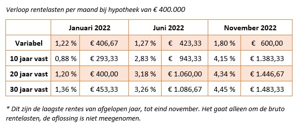 De impact van de sterke stijging op je maandelijkse lasten is groot. Zo betaalde je in januari, met een hypotheek van € 400.000, al snel € 1.000 minder wanneer je de rente voor 30 jaar vastzette. Kijken we naar de variabele rente, dan blijkt het effect minder heftig. Het verschil in maandlasten is nog geen € 200.