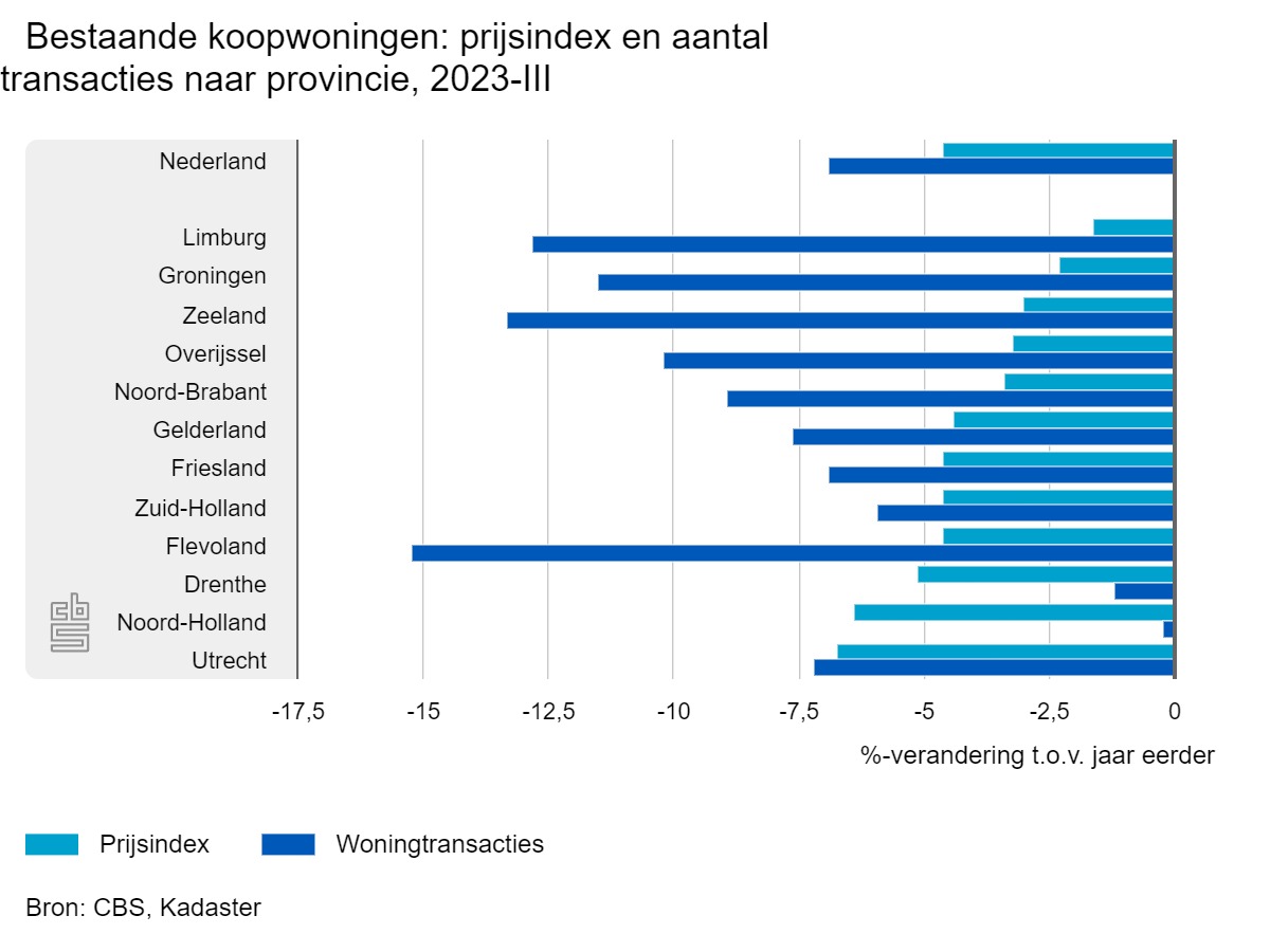De prijzen van bestaande koopwoningen zijn in het derde kwartaal opnieuw lager in alle provincies, vergeleken met een jaar eerder. Dit blijkt uit cijfers van het Centraal Bureau voor de Statistiek (CBS). Kijken we naar de richting van de maand-op-maand woningprijzen, dan zien we vooruitgang. Wel blijft het aantal woningtransacties laag.