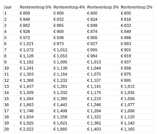 Dit effect wordt nog groter als de huurverhoging geen 2 procent maar bijvoorbeeld gemiddeld 4 procent per jaar is. In die situatie betaal je in jaar 10 al € 1.139 per jaar en bedraagt de huur na 20 jaar € 1.685. In die situatie is de huur ruim verdubbeld sinds de eerste maand. Gelukkig is dit scenario minder waarschijnlijk. De gemiddelde huurstijging in de afgelopen 20 jaar bedroeg circa 2,65 procent. Onderstaand zie je het verloop met verschillende stijgingspercentages.